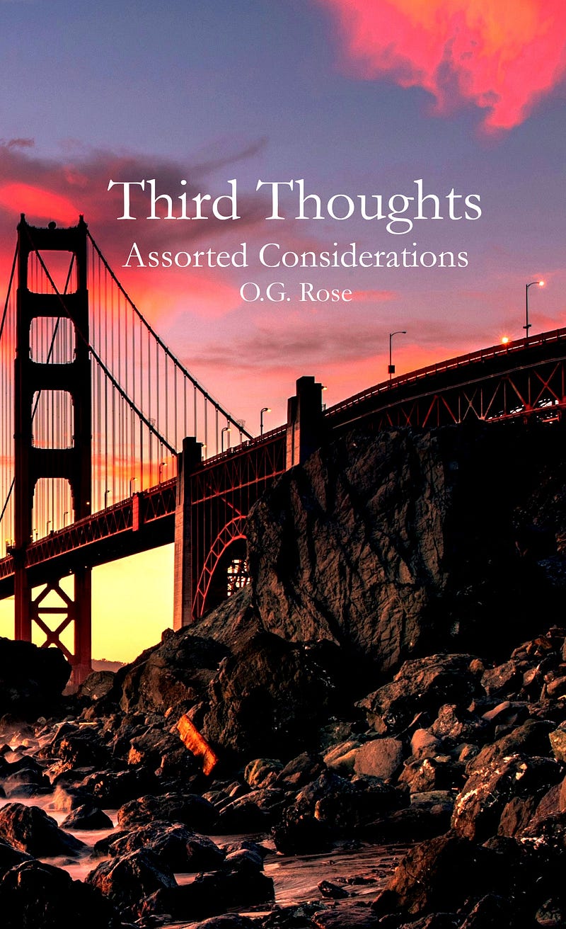 Third Thoughts is a collection of fifty considerations by O.G. Rose, author of Belonging Again, A Philosophy of Glimpses, Under the Wing, and The Conflict of Mind. Readers can enjoy the works in conjunction with each other or treat the collection like a box of chocolates, for each work is a completed insight. Third Thoughts reveals how our ideas are like eyes, giving perspective on everything in life and that we all see from somewhere.