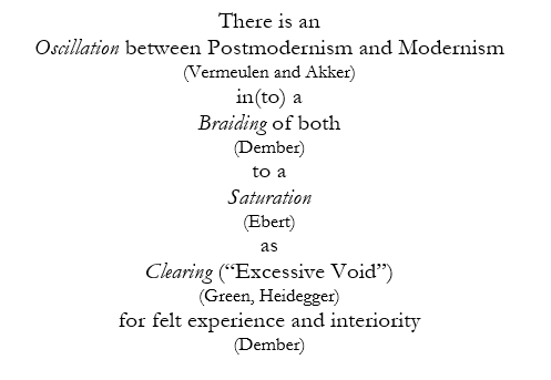 Metamodernism is not moving away from Postmodernism as arguably Postmodernism did from Modernism, but instead trying to “braid” the movements together so that they almost “negate via perfect symmetry” (versus erasure, “a negation of negation”), leaving only us to “shine” (to use a term from Hegel). I imagine with “braiding” almost a game of chess where the author moves a Modernist piece on the board, then a Postmodernist piece to stop the advance, then another Modernist piece, on and on (“impasse” by “impasse”), until the game ends in a stalemate where no pieces can advance, and yet it turns out that this was the goal, because this “pushes up” to the players with the question of how they will react (there is a “structural oscillation” that leads to a “hermeneutic oscillation,” to use excellent language from Dember). Metamodernism invites similar questions.